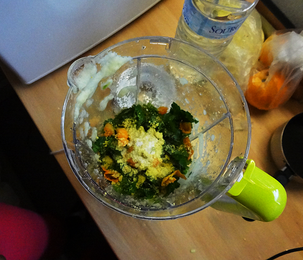 接下來,把剩下來的東西一起丟進去,繼續打到成泥狀(怕太辣的人可以先丟半顆辣椒試試看)